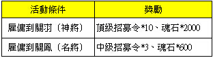 【活動內容】活動期間內,玩家通過招募,雇傭到武將關羽、關鳳,即可獲得指定獎勵。