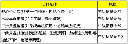 【活動內容】日起只要在遊戲中的客服系統回報您發現的BUG,經塔塔英雄團隊確認無誤,皆可針對以下條件獲得相對獎勵
