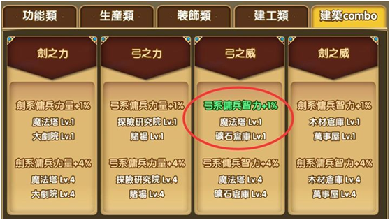 指定的建築物靠在一起可以提升傭兵的能力,建築物的等級越高提升的能力越多。